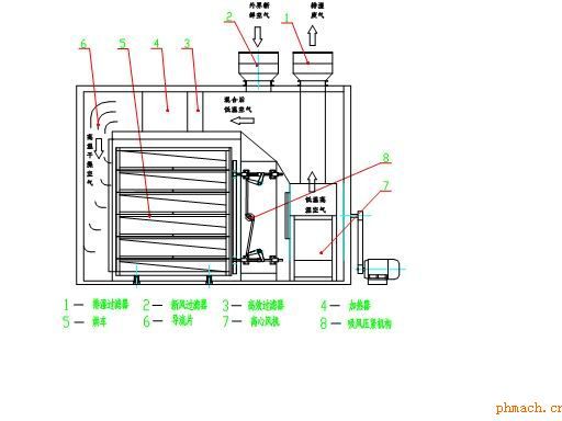 在傳統(tǒng)的水平流廂式干燥器中,氣流只在物料表面流過(guò),其缺點(diǎn)是傳熱系數(shù)低、熱利用率差、物料干燥時(shí)間長(zhǎng).且由于結(jié)構(gòu)的缺陷,無(wú)法完全符合“GMP"藥品生產(chǎn)規(guī)范。為了克服以上缺點(diǎn)。我廠根據(jù)國(guó)外先進(jìn)技術(shù)設(shè)計(jì)開(kāi)發(fā)穿流式箱式干燥器,其工作原理見(jiàn)圖: 本機(jī)由風(fēng)機(jī)將一部分新鮮空氣經(jīng)初、中、高三效過(guò)濾。達(dá)到十萬(wàn)級(jí)凈化,經(jīng)蒸汽熱交換器,使空氣升溫至一定溫度。通過(guò)過(guò)濾器使熱空氣凈化后,再由左側(cè)分流板分至各層,使熱風(fēng)平均通過(guò)每層被干燥的物料。濕空氣從烘盤(pán)底下的傾斜風(fēng)道抽出后,經(jīng)離心風(fēng)機(jī)使一部分濕空氣排出烘箱外。另一部分空氣繼續(xù)循環(huán)加熱。達(dá)到干燥目的