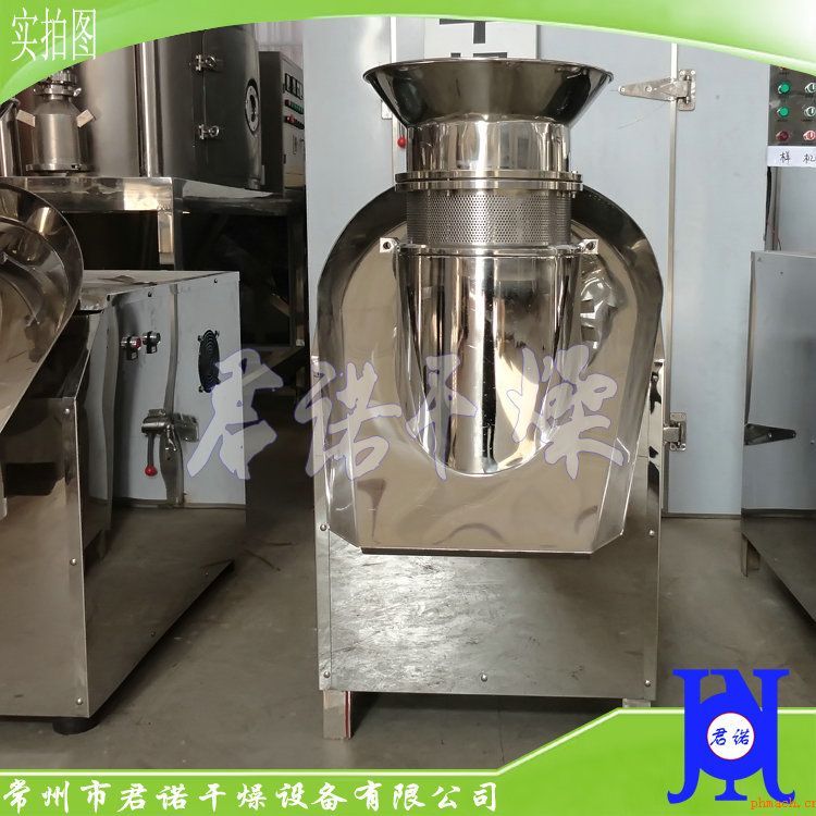 XL旋轉(zhuǎn)制粒機(jī)適用于制藥、化工、食品、中藥沖劑、食品類、固體飲料、雞精及其它帶有粘度物料的制粒。將微潮濕的粉料碾擠成顆料,亦可粉碎廢征和干塊并碾擠成顆粒。 本機(jī)適用于制藥、食品、化工、農(nóng)藥、化肥、輕工等行業(yè)。將潮濕的粉末碾成不同粒度的顆粒,亦可用于將已壓成塊狀的干粉粉碎至所需大小的顆粒。 本機(jī)操作簡單,維修方便,清洗容易,與物料接觸部位均采用不銹鋼材料制成,確保物料不變質(zhì),變色,可根據(jù)需要選擇篩筒孔徑,并可以完成自動(dòng)出料,減少了人工出料造成的顆粒破碎。