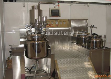 在高粘性乳化物.特別是膏霜.軟膏.乳劑類產(chǎn)品的制造工藝中.通常*成問(wèn)題的是分散相的粒徑大和攪拌時(shí)把空氣混入制品中.粒徑過(guò)大導(dǎo)致乳狀物不穩(wěn)定.缺少光澤,制品中混入空氣則會(huì)使制品氣泡化.細(xì)菌污染.易氧化及外觀不光滑.針對(duì)兩大問(wèn)題.開發(fā)出的ZJR系列真空均質(zhì)乳化機(jī)組.由均質(zhì)攪拌器.中心葉片攪拌.刮壁攪拌各自具有的特點(diǎn)相輔相成.組合成*佳的攪拌方式.以達(dá)到*混合制品.采用抽真空的方式.使所生產(chǎn)的制品在攪拌過(guò)程中不再混入氣泡.從而保證可制造出富有光澤.細(xì)膩及延展性良好的優(yōu)質(zhì)產(chǎn)品. 結(jié)構(gòu): ZJR系列真空均質(zhì)乳化機(jī)組由乳化鍋(可升降鍋蓋.翻轉(zhuǎn)式鍋體)水鍋.油鍋.真空裝置.加熱及溫度控系統(tǒng).冷卻系統(tǒng).電器控制系統(tǒng)均質(zhì)攪拌等系統(tǒng)組成. 工作原理: 物料在水鍋.油鍋內(nèi)通過(guò)加熱.攪拌進(jìn)行混合反應(yīng)后.由真空泵吸入乳化鍋.通過(guò)乳化鍋內(nèi)上部的中心攪拌.聚四氟乙烯刮板始終迎合攪拌鍋形體.掃凈掛壁粘料.使被括取地物料不斷產(chǎn)生新界面.再經(jīng)過(guò)葉片與回轉(zhuǎn)葉片的剪斷.壓縮.折疊.使其攪拌.混合而向下流往鍋體下方的均質(zhì)器處.物料再通過(guò)高速旋轉(zhuǎn)的切割輪與固定的切割套之間所產(chǎn)生的強(qiáng)力的剪斷.沖擊.亂流等過(guò)程.物料在剪切縫中被切割.迅速破碎成200nm-2um的微粒.由于乳化鍋內(nèi)處于真空狀態(tài).物料在攪拌過(guò)程中產(chǎn)生的氣泡被及時(shí)抽走. 特點(diǎn): 料鍋蓋為自動(dòng)升降式.水鍋.油鍋中的物料通過(guò)輸送管道可在真空狀態(tài)下直接吸入乳化鍋.出料方式為乳化鍋鍋體翻轉(zhuǎn)可傾式.通過(guò)電熱管對(duì)鍋夾層內(nèi)的導(dǎo)熱介質(zhì)進(jìn)行加熱來(lái)實(shí)現(xiàn)對(duì)物料的加溫.加熱溫度任意設(shè)定.自動(dòng)控制.在夾層內(nèi)接入冷卻水即可對(duì)物料進(jìn)行冷卻.操作簡(jiǎn)單.方便.夾層外設(shè)有保溫層.均質(zhì)攪拌與槳葉攪拌可分開使用.也可同時(shí)使用.物料微粒化.乳化.混合.調(diào)勻.分散等可于短時(shí)間內(nèi)完成.與物料接觸部位采用優(yōu)質(zhì)不銹鋼(食品,醫(yī)用采用316L材料制造.內(nèi)表面鏡面拋光.真空攪拌裝置衛(wèi)生清潔.采用符合GMP規(guī)范的衛(wèi)生標(biāo)準(zhǔn)制造.是*理想的膏.霜生產(chǎn)設(shè)備) Structure: ZJR series vacuum homogenizing emulsifying unit consists of emulsifying pot (lid can be lifted. Flip pot body) water pot. Frying pan. Vacuum device. Heating and temperature control system. Cooling system. Electrical control system homogeneous mixing system composition. How it works: Material in water pan. Oil pan through heating. Stir after the mixing reaction. Suction by vacuum pump emulsion pot. Stir through the center of the upper inner part of the emulsifying pan. The teflon scraper always fits the shape of the mixing pan. Clean the hanging wall adhesives. Make the enclosed material continuously create a new interface. Then through the blade and rotary blade cutting. Compress. Fold. Stir. Mix and flow down to the homogenizer below the pan body. The material is then subjected to a strong shear between a high-speed rotating cutting wheel and a fixed cutting sleeve. Shock, turbulence and other processes. The material is cut in a shear joint. Rapidly broken into 200nm-2um particles. Because the emulsification pot is in a vacuum state. The bubbles produced by the material in the process of mixing are pumped away in time. Features: The lid of the pot is automatically raised and lowered. Water pot. The material in the oil pot can be directly sucked into the emulsion pot under vacuum through the conveying pipe. Discharging method is emulsified pot body turning tilting type. The heat conduction medium in the interlayer is heated by electric heat pipe to realize the heating of the material. Heating temperature is arbitrarily set. Automatic control. The material can be cooled by connecting the cooling water inside the sandwich. Easy to operate. Convenient. A thermal insulation layer is provided outside the sandwich. Homogeneous stirring and blade stirring can be used separately. Can also be used at the same time. Material granular. Emulsify. Mix. Mix well. Dispersion can be completed in a short time. The parts in contact with the material are made of high-quality stainless steel (food, medical use of 316L material). Internal surface mirror finish. The vacuum mixing device is hygienic and clean. Adopt hygienic standards in accordance with GMP specifications. Is the most ideal paste. Cream production equipment) |