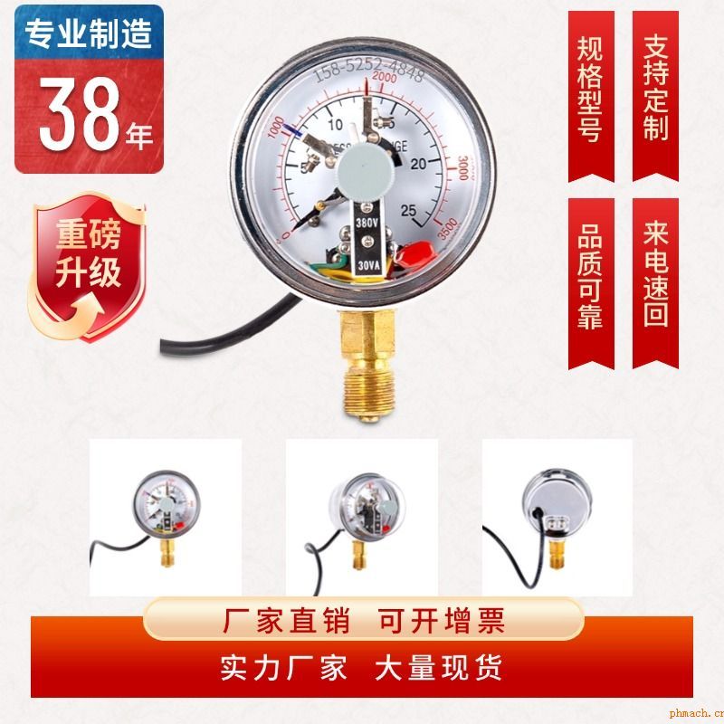 電接點壓力表廣泛應(yīng)用于石油、化工、冶金、電站、食品等工業(yè)部門或機電設(shè)備配套中測量無爆炸危險的各種流體介質(zhì)的壓力。通常,儀表經(jīng)與相應(yīng)的電氣器件(如繼電器及接觸器等)配套使用,即可對被測(控)壓力系統(tǒng)實現(xiàn)自動控制和發(fā)信(報警)的目的。接液材質(zhì)有銅質(zhì)或不銹鋼等用戶可根據(jù)實際使用情況可選。電接點壓力表的工作原理是基于測量系統(tǒng)中的彈簧管在被測介質(zhì)的壓力作用下,追使彈簧管之末端產(chǎn)生相應(yīng)的彈性變形一位移,借助拉桿經(jīng)齒輪傳動機構(gòu)的傳動并予放大,由固定齒輪上的指示(連同觸頭)逐將被測值在度盤上指示出來。與此同時,當(dāng)其與設(shè)定指針上的觸頭(上限或下限)相接觸(動斷或動合)的瞬時,致使控制系統(tǒng)中的電路得以斷開或接通,以達(dá)到自動控制和發(fā)信報警的目的。 安裝方式:徑向直接安裝;徑向帶前邊安裝;徑向帶后邊安裝;軸向安裝;軸向帶前邊安裝;軸向帶后邊安裝;卡箍式安裝;螺紋安裝;法蘭安裝。