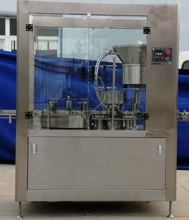 全自動西林瓶軋蓋機(jī) 一、組成及工作原理 全自動西林瓶軋蓋機(jī)是由八套或十二套軋蓋頭、一個錳鋼軋蓋刀、鋁蓋振蕩器、理瓶機(jī)等主要部件組成。軋蓋頭有上下瓶托組成一套軋蓋頭,采用振蕩器自動理蓋和供蓋。軋蓋時,理瓶盤(器)理瓶、送瓶,進(jìn)行入軋蓋機(jī)后,瓶子在軋蓋頭(上下瓶托)的帶動進(jìn)行高速旋轉(zhuǎn)進(jìn)入軋蓋刀下,軋蓋刀不動,高速旋轉(zhuǎn)的軋蓋頭整體再圍繞軋蓋刀進(jìn)行旋轉(zhuǎn)一周即完成軋蓋。單刀多頭軋蓋機(jī)調(diào)換瓶子規(guī)格方便,更換規(guī)格時如果瓶子直徑大小一樣只需要調(diào)節(jié)上下瓶托的高度就行,不需要更換其他配件,單刀軋蓋機(jī)兼容性強(qiáng),從1ml西林瓶到500ml西林瓶都能做,全自動軋蓋機(jī)既可獨立單機(jī)完成軋蓋,也可與灌裝機(jī)或粉裝機(jī)聯(lián)接成聯(lián)動線使用。聯(lián)動線使用時不需要人工操作或照看,只需要打開機(jī)器與前端灌裝機(jī)或分裝機(jī)和后端貼標(biāo)機(jī)速度匹配好,自動進(jìn)行生產(chǎn)就可。 二、簡介: 全自動西林瓶軋蓋機(jī)主要用于西林瓶、西林瓶管制瓶、西林模制瓶、抗生素玻璃瓶或PE瓶、塑料瓶的鋁蓋或鋁塑復(fù)合蓋封口、鎖蓋、軋蓋或壓蓋。