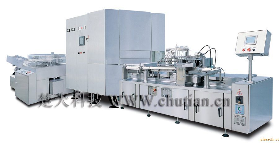 本聯(lián)動(dòng)機(jī)組由QCL系列立式超聲波清洗機(jī)、KSZ系列殺菌干燥機(jī)、AGF系列安瓿灌封機(jī)三臺(tái)單機(jī)組成,分為清洗、干燥滅菌、灌裝封口三個(gè)工作區(qū)。每臺(tái)可單機(jī)使用,也可聯(lián)動(dòng)生產(chǎn),聯(lián)動(dòng)生產(chǎn)時(shí)可完成噴淋水、超聲波清洗、機(jī)械手夾瓶、翻轉(zhuǎn)瓶、沖水(瓶?jī)?nèi)、瓶外)、沖氣(瓶?jī)?nèi)、瓶外)、預(yù)熱、烘干滅菌、冷卻、(前沖氣)、灌裝、(后沖氮)、預(yù)熱、封口等二十多個(gè)工序。主要用于制藥廠針劑車(chē)間小容量注射劑生產(chǎn)。其改進(jìn)型既可用于安瓿瓶針劑也可用于抗生素瓶針劑的多功能生產(chǎn)。