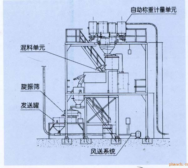 | 1.主料倉、輔料倉、開袋站;完成由散料(袋裝、槽車等)進入料倉 2.自動稱重配料系統(tǒng):將按配方稱量的各種物料進行自動稱重 3.液料系統(tǒng):按重量向混合機組提供所需的液體輔料 4.混合機組:將按配方稱量的各種物料進行混合 5.干混料倉:盛放混合好后的物料,準備供給下道工序 6.風送系統(tǒng):完成物料的輸送,正壓風送或負壓吸送,集中供料等 7.輔助系統(tǒng):平臺、框架、橋架等 8.中央除塵系統(tǒng):向各個需除塵的點,提供引吸風量、集塵 9.計算機管理系統(tǒng):智能化管理、數據統(tǒng)計、處理、觸摸屏模擬實時顯示整個流程 |