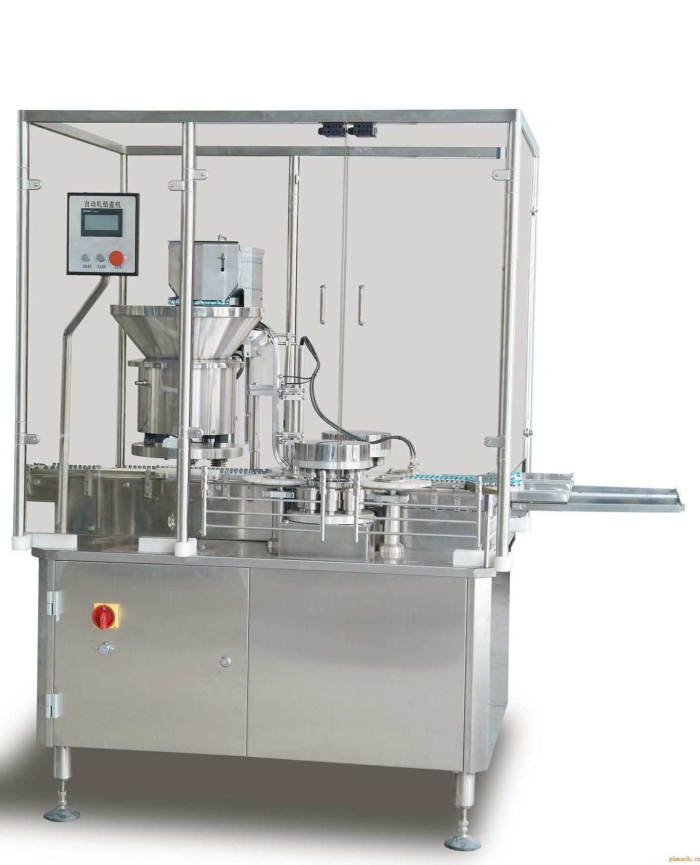 GKZD500軋鋁蓋機 軋鋁蓋機采用國外先進技術,具有機構(gòu)設計獨特,制造精良,高效快速,噪音低等特點。具有速度快,破損率低,鋁蓋軋蓋部位外形美觀等優(yōu)點。適合各藥廠單機或配套連線使用。 本機采用雙軌形式,有2個軋蓋工作站同時工作,速度快且性能穩(wěn)定,還具有變頻調(diào)速,自動供蓋控制和自動計數(shù)等功能。