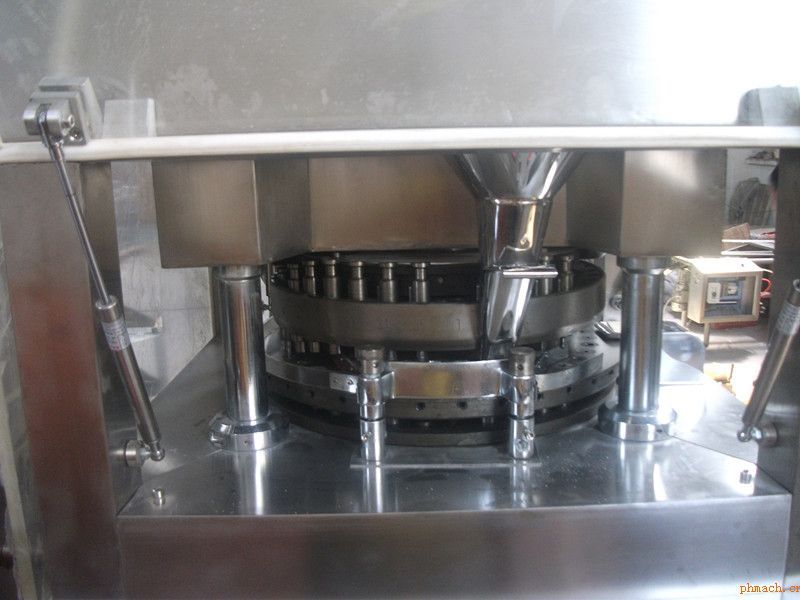 本機(jī)是一種雙壓式自動(dòng)旋轉(zhuǎn),連續(xù)壓片的機(jī)器,將顆粒狀原料壓制成成劑。它主要用于制藥工業(yè)的片劑生產(chǎn),同時(shí)適用于化工,食品,電子等工業(yè)部門(mén)。外圍罩殼為全卦閉形式,材料采用不銹鋼,內(nèi)部臺(tái)面用不銹鋼材料,能保持表面光澤與防止交叉污染,符合GMP要求。裝有透明玻璃的門(mén)窗,能清楚觀察壓片的狀態(tài),側(cè)面板能全部打開(kāi),易于內(nèi)部清洗和保養(yǎng)。所有控制器和操作件均布局合理。采用變頻調(diào)速裝置進(jìn)行電氣調(diào)速,操作方便,轉(zhuǎn)動(dòng)平穩(wěn),安全準(zhǔn)確。配有過(guò)載保護(hù)裝置,當(dāng)壓力過(guò)載時(shí),能自動(dòng)停機(jī)。實(shí)行機(jī)電一體化,采用觸模建及屏幕顯示。傳動(dòng)系統(tǒng)密閉在機(jī)器主體下方油箱中,是完全分離的獨(dú)立部件,亦不會(huì)產(chǎn)生油污污染,又使傳動(dòng)部件浸潤(rùn)在油池中,易散熱且耐磨。機(jī)器裝有吸塵裝置,能將壓制室內(nèi)飛揚(yáng)的粉塵吸收干凈。機(jī)器的易用損件如上軌道,加料器,料斗,傳動(dòng)蝸桿,粉量器等與ZP33型產(chǎn)品具有通用結(jié)構(gòu),有得于標(biāo)準(zhǔn)化、通用化、系列化。
