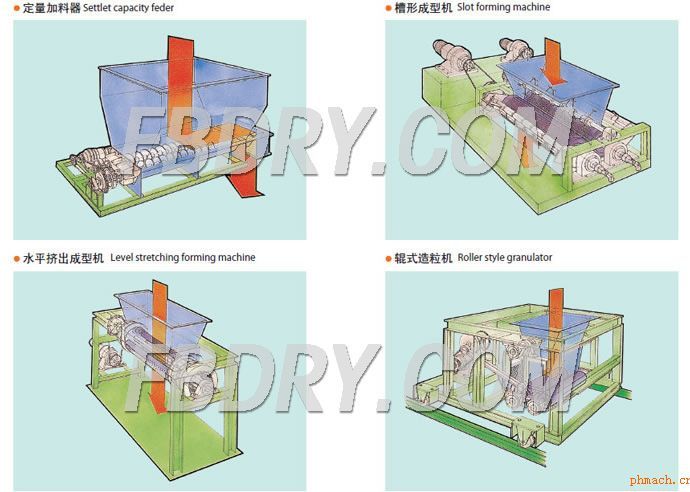 ◎水平擠出成型機: 由加料斗、二根輥子和U形振動網(wǎng)構(gòu)成。以增大物料的表面積為目的,造粒物料與振動網(wǎng)接觸,由旋轉(zhuǎn)輥子的強制壓力擠出網(wǎng)外,形成圓柱形的顆粒。